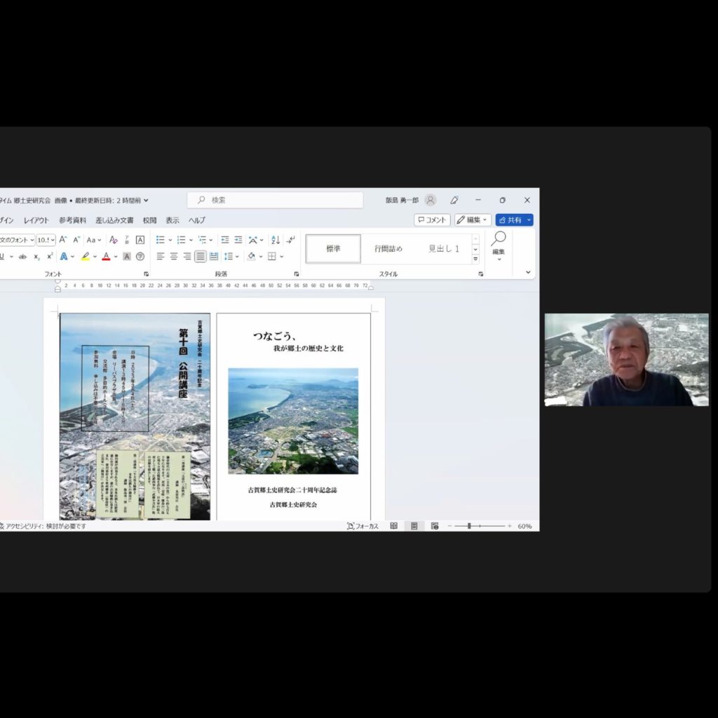 前回は主催するための操作方法だったのですが、今回は、主催する際の注意点を知ってもらうために、スタッフがオンライン会議をする上での良い例・悪い例を演じて、その改善点などを意見してもらったり、参加者に司会をお願いしてオンラインでの会話を実践してもらいました。団体告知タイムでは、古賀郷土史研究会さんに20周年記念誌と3/4にある公開講座のお知らせをしていただきました。こちらもYouTubeに動画をアップする予定ですのでお楽しみに!公開講座にもぜひ足を運んでくださいね!